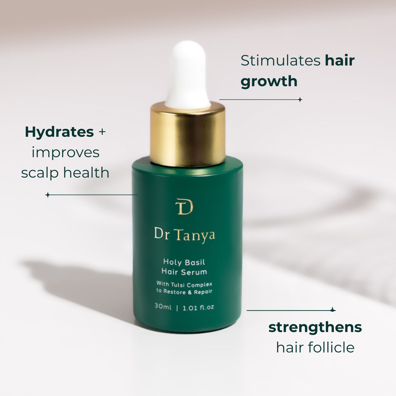 A unique scalp and hair serum containing sacred Indian Holy Basil. Revive the dullest, tired-looking hair instantly with Dr Tanya's Holy Basil Hair Serum.